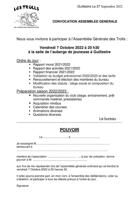 L'assemblée générale du club des trolls ski nordique aura lieu le Vendredi 7 Octobre 2022 à 20h30 à la salle de l'auberge de jeunesse à Guillestre.Cette assemblée est importante pour la saison à venir,tous les parents des adhérents (ainsi que les futurs adhérents) et les membres sont invités à assister à cette réunion,on compte sur vous!!